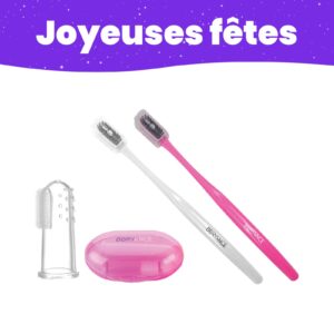 - 1 finger brush; brosse à dents de doigt en silicone, avec étui.